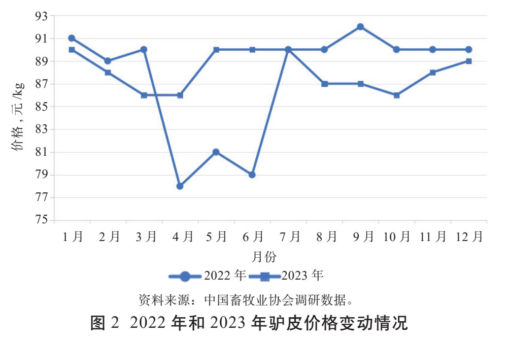 2023年全年驢皮價(jià)格小幅波動(dòng)。5—7月驢皮達(dá)最高價(jià)格,為90元/kg,其余時(shí)間在86~90元/kg波動(dòng)變化(圖2)。驢皮價(jià)格在1—3月呈現(xiàn)逐漸下降趨勢(shì);受活驢價(jià)格上漲拉動(dòng),4月份驢皮價(jià)格增長(zhǎng)至90元/kg,并維持該價(jià)格直至7月。下半年驢皮價(jià)格先是小幅下跌,在10月份觸底反彈,并在12月回升至89元/kg。冬季驢皮品質(zhì)較高,且具“食療冬補(bǔ)”特效,導(dǎo)致其需求上升,價(jià)格上漲。相較于往年,2023年的驢皮價(jià)格總體比較穩(wěn)定。近年來(lái),驢皮價(jià)格波動(dòng)十分劇烈,從2017年頂峰的160元/kg暴跌至2020年的40~50元/kg,隨后于2021年開(kāi)始回升并維持在90元/kg左右[3]。隨著新冠肺炎疫情影響的減弱,驢皮價(jià)格隨著阿膠產(chǎn)業(yè)的逐步恢復(fù)而開(kāi)始回升。我國(guó)驢皮供給量不足全球總供給量的1/4,國(guó)內(nèi)主要依靠進(jìn)口[4]。2021年以后,隨著驢皮進(jìn)口數(shù)量增加,驢皮價(jià)格在一定程度上開(kāi)始回落。整體看來(lái),驢皮對(duì)國(guó)外進(jìn)口依賴度高,價(jià)格不確定性大,未來(lái)我國(guó)驢皮價(jià)格依然存在著波動(dòng)的挑戰(zhàn)。