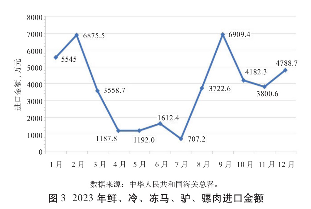 此外,我國(guó)驢業(yè)面臨的進(jìn)口沖擊不容小覷。2023年我國(guó)鮮、冷、凍馬、驢、騾進(jìn)口總金額約為4.41億元,較上年增長(zhǎng)了184.5%。進(jìn)口的大幅增加與國(guó)內(nèi)市場(chǎng)供需失衡情況有關(guān),隨著市場(chǎng)回暖,驢業(yè)需求增加但存欄量不增反減,需要通過(guò)進(jìn)口滿足市場(chǎng)需求。據(jù)統(tǒng)計(jì),目前國(guó)內(nèi)驢肉產(chǎn)量只能滿足國(guó)內(nèi)需求量的20%~30%,其余部分需要通過(guò)進(jìn)口彌補(bǔ)。全年范圍內(nèi),進(jìn)口金額呈現(xiàn)波動(dòng)狀態(tài)。具體來(lái)看,2月和9月進(jìn)口額最高,分別達(dá)到了6 875.5萬(wàn)元、6 909.4萬(wàn)元(圖3);4—7月出現(xiàn)了短期低迷情況,7月份進(jìn)口金額達(dá)到最低點(diǎn)707.2萬(wàn)元,春夏交際期間,國(guó)內(nèi)活驢供給相對(duì)充足,進(jìn)口量相對(duì)減少。我國(guó)驢存欄量逐年減少,供給嚴(yán)重依靠國(guó)外進(jìn)口,進(jìn)口額的波動(dòng)對(duì)國(guó)內(nèi)市場(chǎng)造成了一定的不確定性[5]??傮w來(lái)看,由于國(guó)內(nèi)供給能力不足,國(guó)內(nèi)驢存欄量持續(xù)下降,在未來(lái)一段時(shí)間,驢業(yè)面臨的進(jìn)口沖擊將依然存在。
