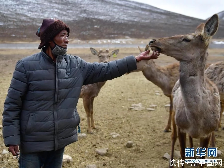 甘德縣崗龍鄉(xiāng)恰不將村生態(tài)畜牧業(yè)專業(yè)合作社村民在鹿場喂鹿。