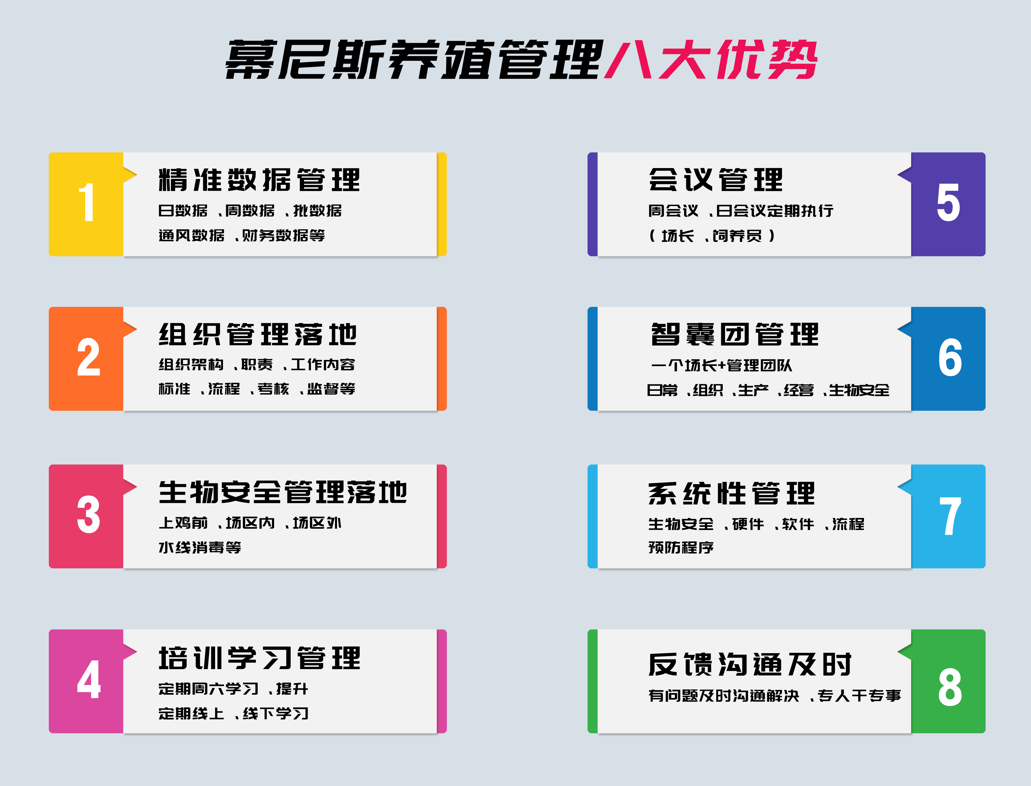 公司成立以來(lái),以科技為本,堅(jiān)持理論聯(lián)系實(shí)際,秉承“做精細(xì)化管理,創(chuàng)養(yǎng)殖高效益”的經(jīng)營(yíng)理念。通過(guò)對(duì)規(guī)?;B(yǎng)殖場(chǎng)提供系統(tǒng)管理,開(kāi)創(chuàng)了精細(xì)化1258管理系統(tǒng),精細(xì)化36524操作流程,精細(xì)化37112保健方案,被業(yè)內(nèi)同仁稱為“幕尼斯精細(xì)化管理模式”。
