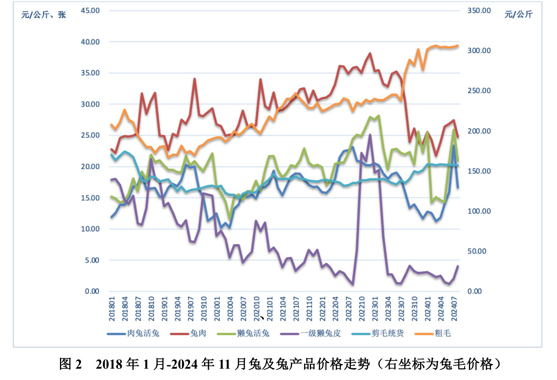 圖2為2018年1月—2024 年11月兔及兔產(chǎn)品月度價(jià)格走勢(shì)??傮w來看,粗毛價(jià)格呈上升趨勢(shì),剪毛統(tǒng)貨的價(jià)格雖有波動(dòng),但相對(duì)比較平穩(wěn),獺兔活兔、肉兔活兔、兔肉和獺兔皮價(jià)格呈現(xiàn)波動(dòng)變化狀態(tài)。具體來看,肉兔活兔價(jià)格從2024年8月開始回升,10月價(jià)格大幅上漲,比去年同期上漲了30%,達(dá)到近五年同期最高價(jià)格,11月價(jià)格回落,環(huán)比下降29%,與去年同期基本持平;獺兔活兔價(jià)格在2024年前三季度與去年同期比較低,5-8月價(jià)格為近三年低谷,9-10月獺兔活兔價(jià)格上漲較快,2024年10月價(jià)格已超過去年同期價(jià),11月價(jià)格由升轉(zhuǎn)降,環(huán)比下降 19%,與去年同期比下降 5%;兔肉價(jià)格從2023年5月開始下降,2024年1月價(jià)格有所提振,呈現(xiàn)波動(dòng)回升,但與往年相比,兔肉價(jià)格仍然較低,11月肉兔價(jià)格再次下降,比去年同期低 19%;一級(jí)獺兔皮價(jià)格變化趨勢(shì)于2024年10月扭轉(zhuǎn),11月價(jià)格達(dá)2024年高點(diǎn)。兔毛產(chǎn)品價(jià)格相對(duì)比較平穩(wěn),2023年10月后粗毛價(jià)格出現(xiàn)大幅上漲,2024年4月后基本保持平穩(wěn),僅有微弱調(diào)整;剪毛統(tǒng)貨總體平穩(wěn),2023年9月后波動(dòng)上升,同樣于2024 年4月之后保持平穩(wěn)狀態(tài),變動(dòng)較小。