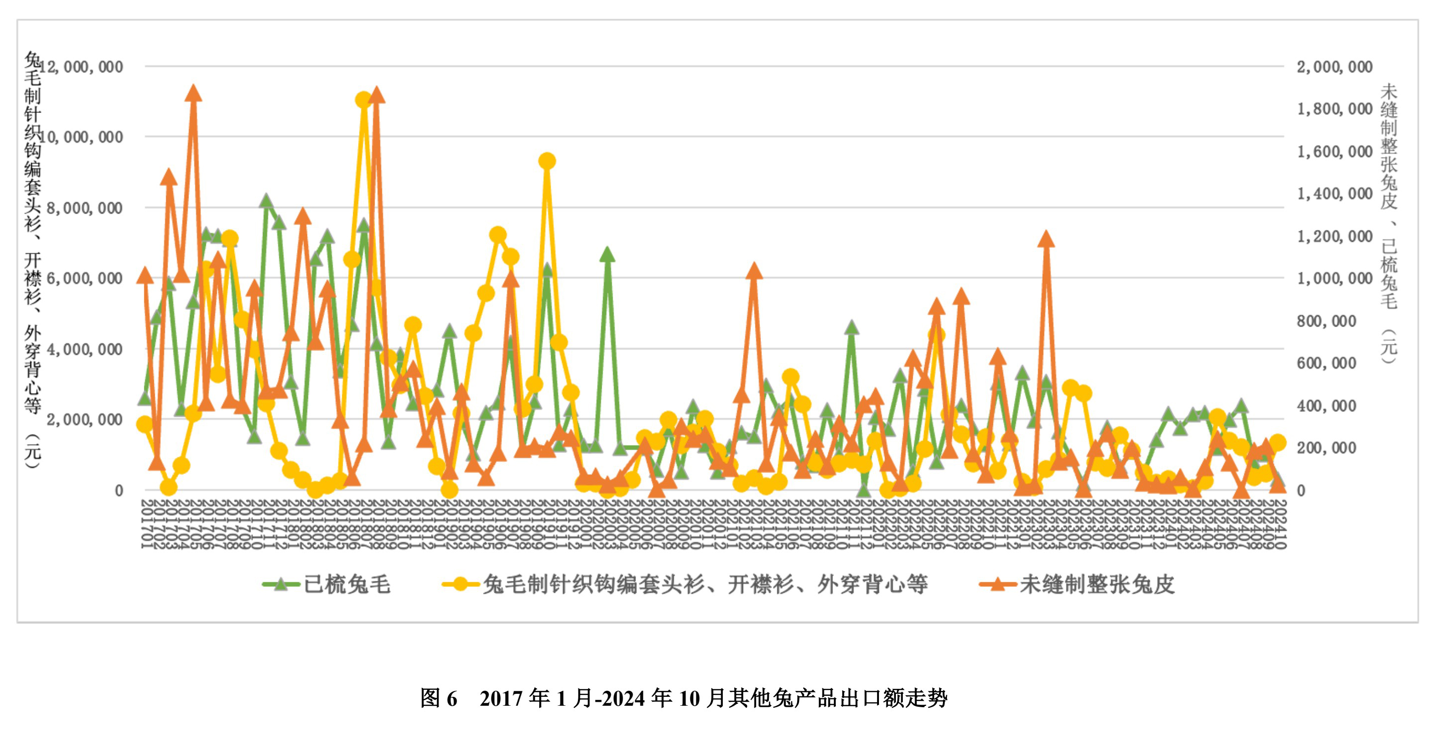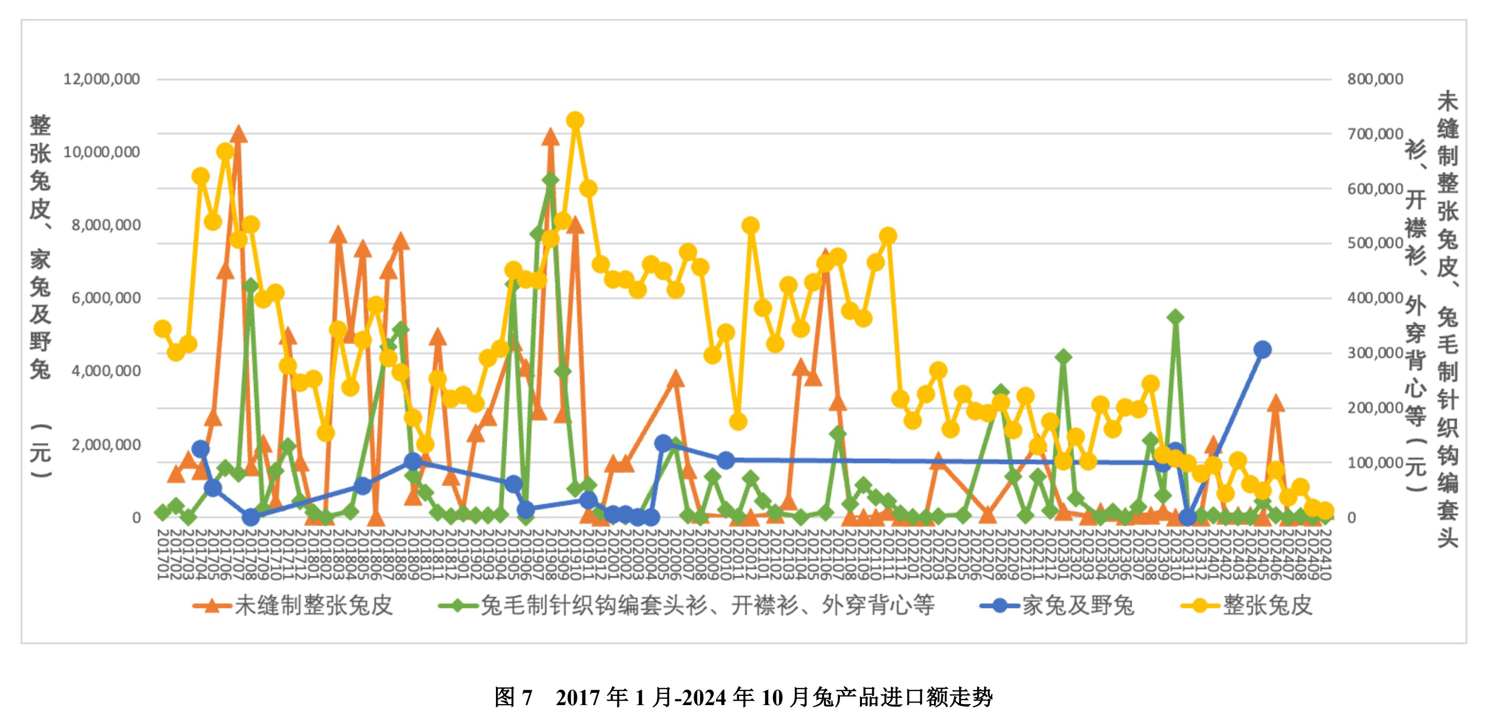 2024 年 10 月份整張兔皮進(jìn)口額為 17.97 萬元,較上月下降 35.02%;未縫制整張兔皮進(jìn)口 1.24 萬元,兔毛制針織鉤編套頭衫、開襟衫、外穿背心等進(jìn)口 1716元(見圖 7)。