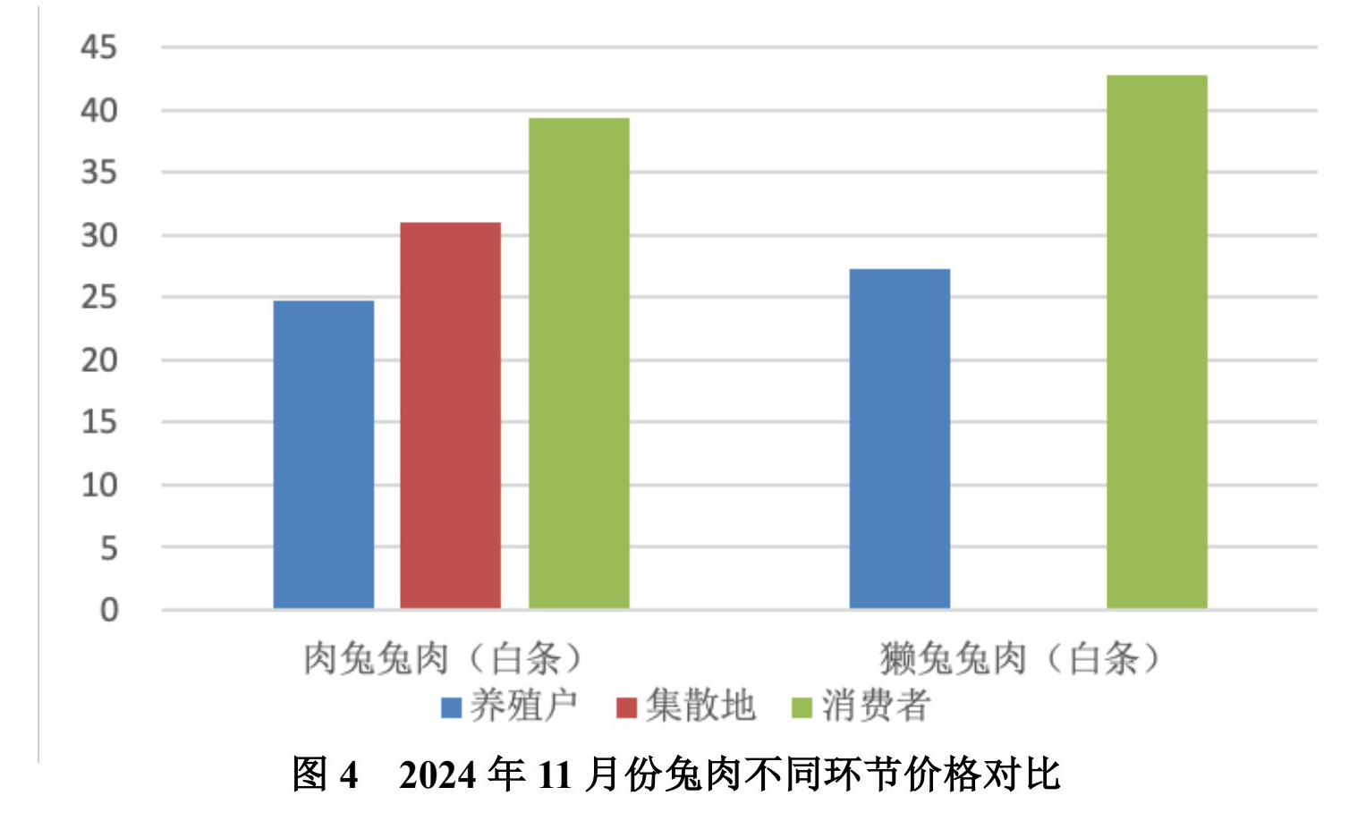 為了考察兔產(chǎn)業(yè)不同環(huán)節(jié)間的獲益情況,體系研發(fā)中心從 2011 年 1 月份開始對(duì)養(yǎng)殖戶銷售、集散地交易(批發(fā))和消費(fèi)者價(jià)格進(jìn)行監(jiān)測,并對(duì)監(jiān)測點(diǎn)和監(jiān)測內(nèi)容在以后各期逐漸完善。目前對(duì)六個(gè)大城市(北京、廣州、上海、福州、成都、重慶)兔肉的消費(fèi)價(jià)格進(jìn)行監(jiān)測,采集于有關(guān)超市。下面以肉兔兔肉和獺兔兔肉不同環(huán)節(jié)的價(jià)格為例,對(duì)各環(huán)節(jié)利益分配進(jìn)行分析,其中獺兔兔肉(白條)2024 年 11 月份集散地價(jià)格數(shù)據(jù)缺失(見圖 4)。