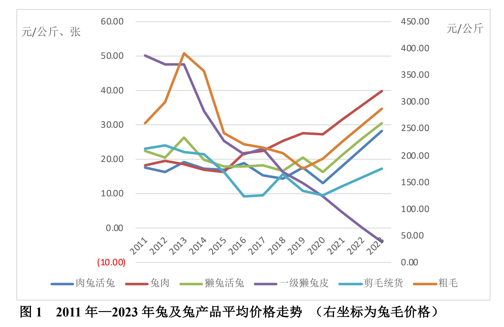 關(guān)注兔產(chǎn)品價(jià)格長期走勢(shì)。圖1為 2011年—2023年兔及兔產(chǎn)品年平均價(jià)格走勢(shì),肉兔活兔和獺兔活兔價(jià)格呈上升趨勢(shì),且價(jià)格波動(dòng)情況類似,兔肉價(jià)格總體也呈上升趨勢(shì);兔毛產(chǎn)品中,剪毛統(tǒng)貨價(jià)格波動(dòng)幅度較大,近三年呈上升趨勢(shì),粗毛價(jià)格在經(jīng)歷一段時(shí)間的下降后開始回升,近五年不斷上升;一級(jí)獺兔皮價(jià)格總體呈下降趨勢(shì)。