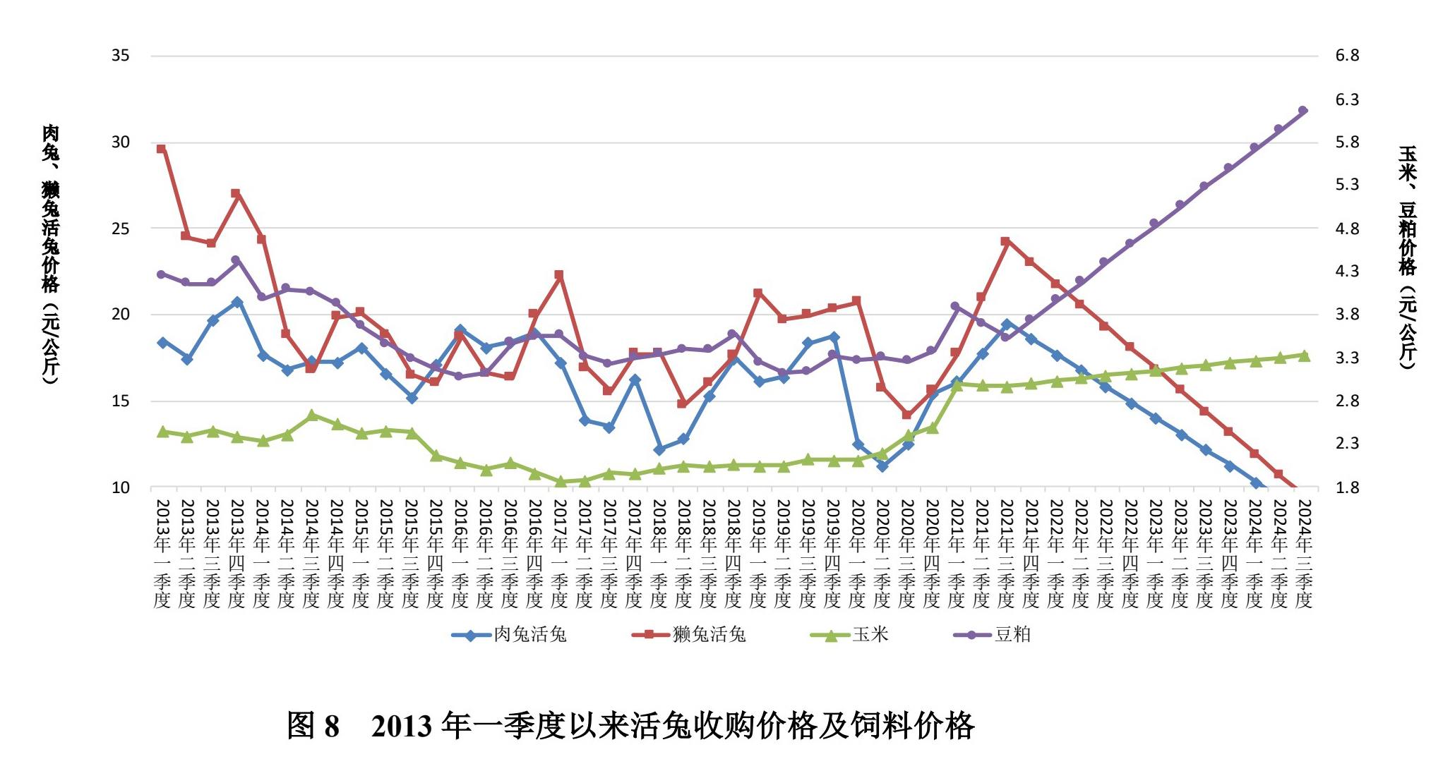 近年活兔收購價(jià)格及飼料價(jià)格比較圖示。